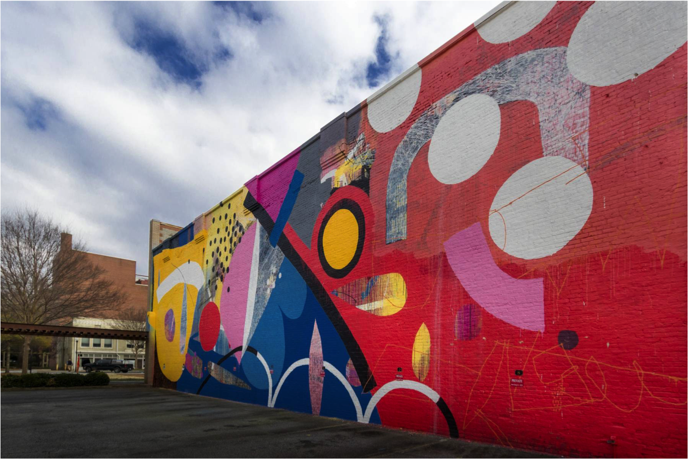 “With this project, I really like to use the existing architecture and environment as inspiration for the direction of the painting. While in Columbus for a site visit, I noticed the historic buildings located in close proximity to the wall. One thing that is important is the location of my installations and what surrounds them. It can be in the context of an urban environment, Museum or Gallery setting. I find an interesting juxtaposition between historic architecture and contemporary public art. My exterior works are treated similarly to my studio practice with focus on simple forms, shape, line, color, gesture, mark making and experimentation.