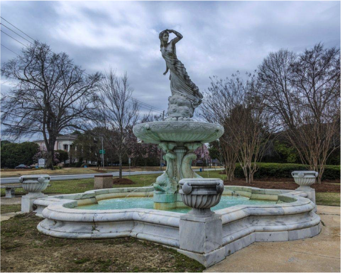 Another article notes that the fountain is a “beautiful memorial to a beautiful life…one of the permanent attractions and adornments of Wynnton.” The fountain was commissioned by her niece, and was carved in Italy. Many today mistakenly say that the figure gazes toward Ft. Benning, but the contemporary description was this: “the majestic figure of a woman poised in the attitude of soaring through space. One hand shields her eyes, as she gazes into the future.”
